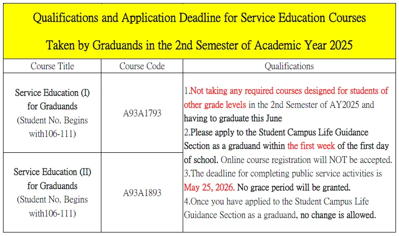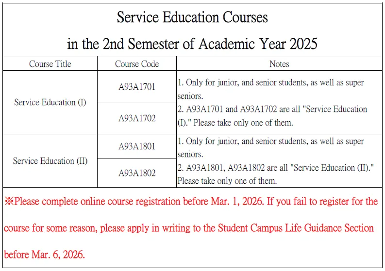 Service Education Courses in the 2nd Semester of Academic Year 2025